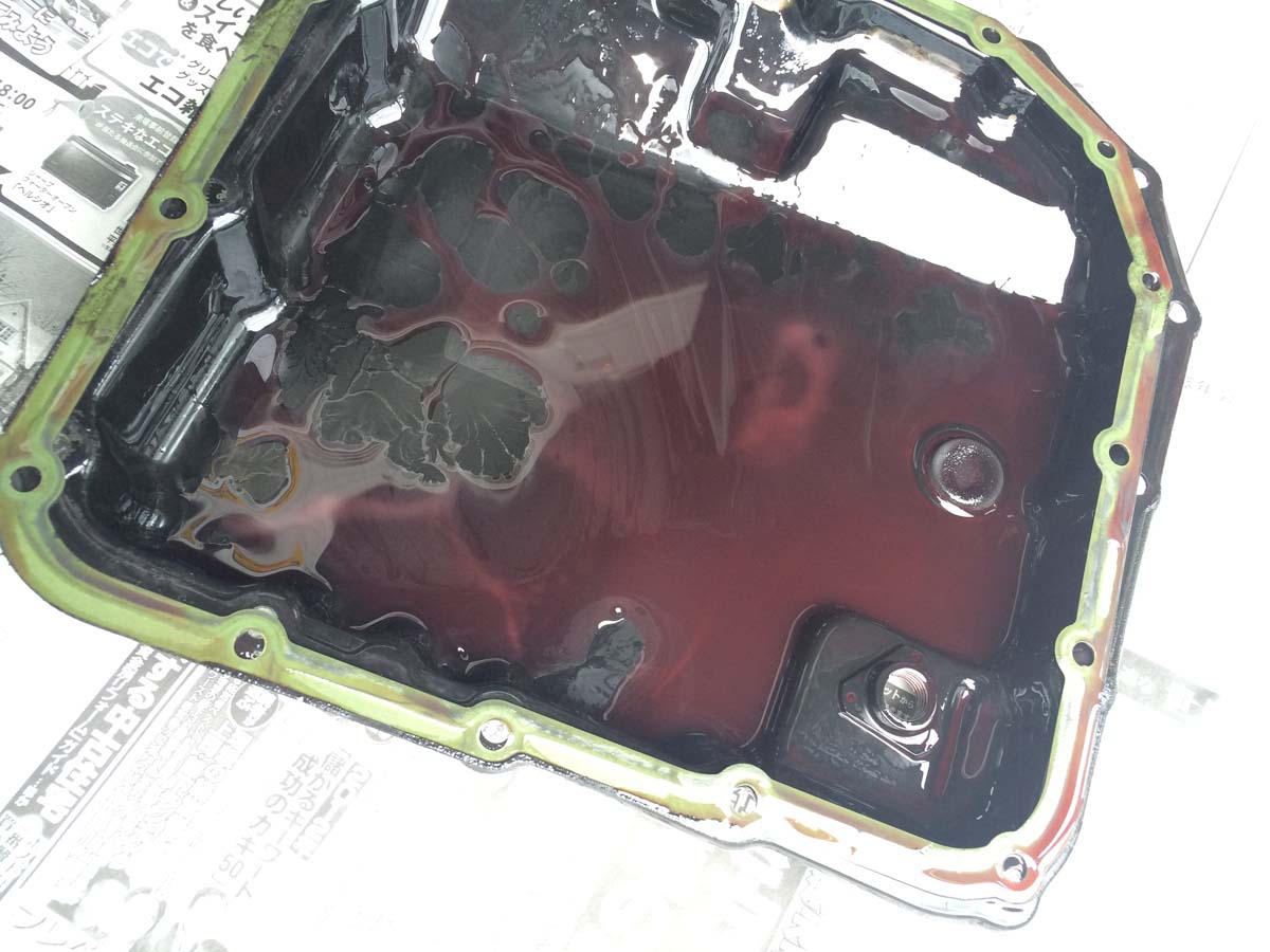 外したオイルパンの底には、汚れたATF・CVTFと鉄粉が溜まっています。